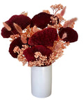 The Mush Love is a one of a kind dried flower arrangement designed using shades of red sponge mushrooms with pink filler designed in a white vase.