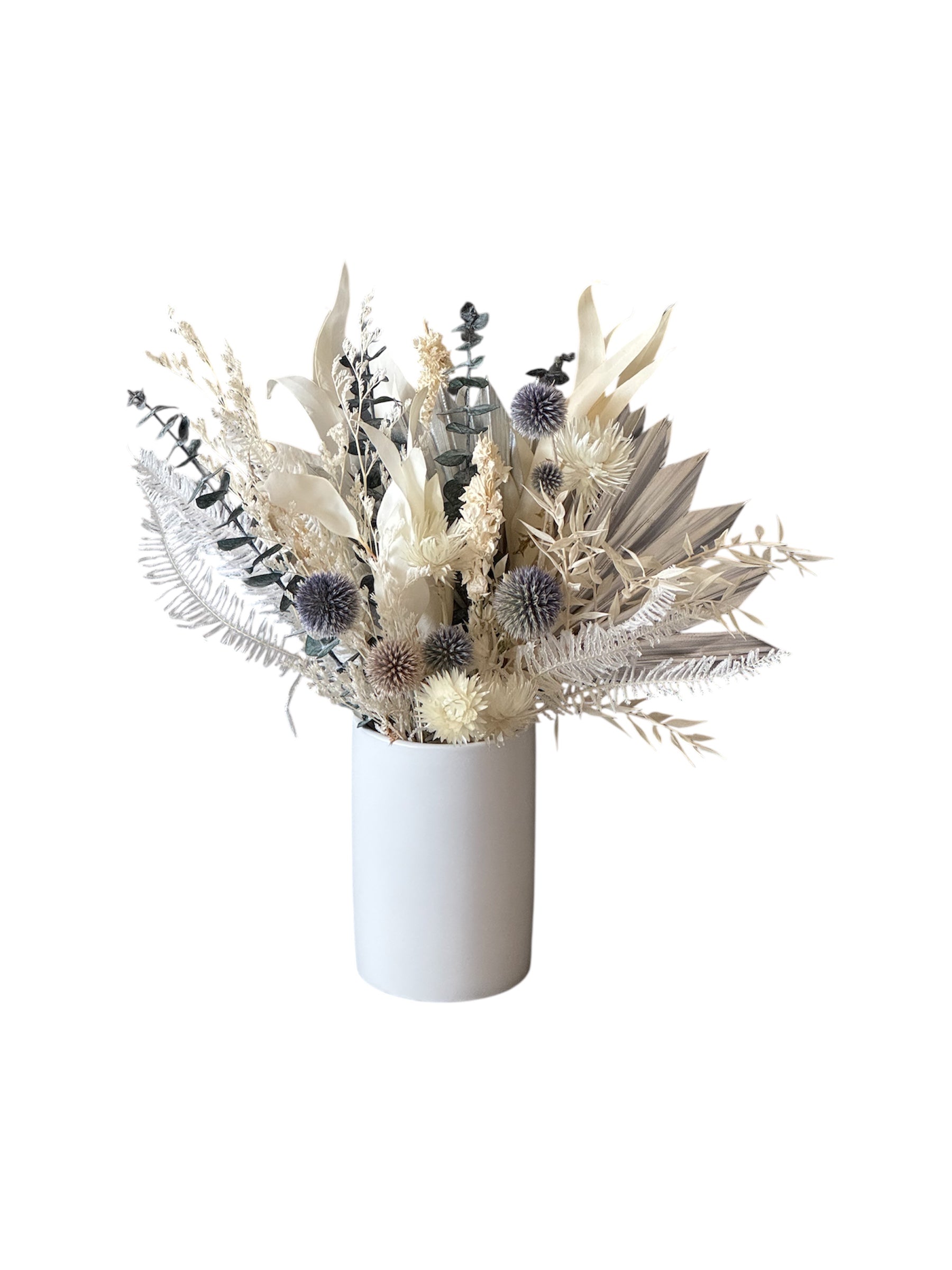 The Winter Dried Floral Arrangement is a one of a kind dried floral arrangement designed using stems with whites, creams, blues and silver in a white vase.