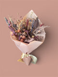 The Mauve Dried Flower Bouquet is a one of a kind dried flower bouquet designed using a variety of tones in dark and lighter purples with neutral tones wrapped in tissue and ribbon.