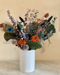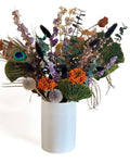 The Octobers a one of a kind dried floral arrangement designed using greens, purples, oranges, black, and a pop of peacock feather in a white vase.