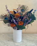 The Octobers a one of a kind dried floral arrangement designed using greens, purples, blues, orange and black with a pop of peacock feathers in a white vase.